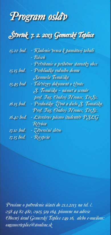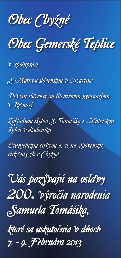 200. výročie narodenia Samuela Tomášika Posted on 27. apríla 2015 by gemersketeplice S finančnou podporou Banskobystrického samosprávneho kraja. Obec Gemerské Teplice touto cestou vyslovuje Banskobystrickému samosprávnemu kraju úprimné poďakovanie.
