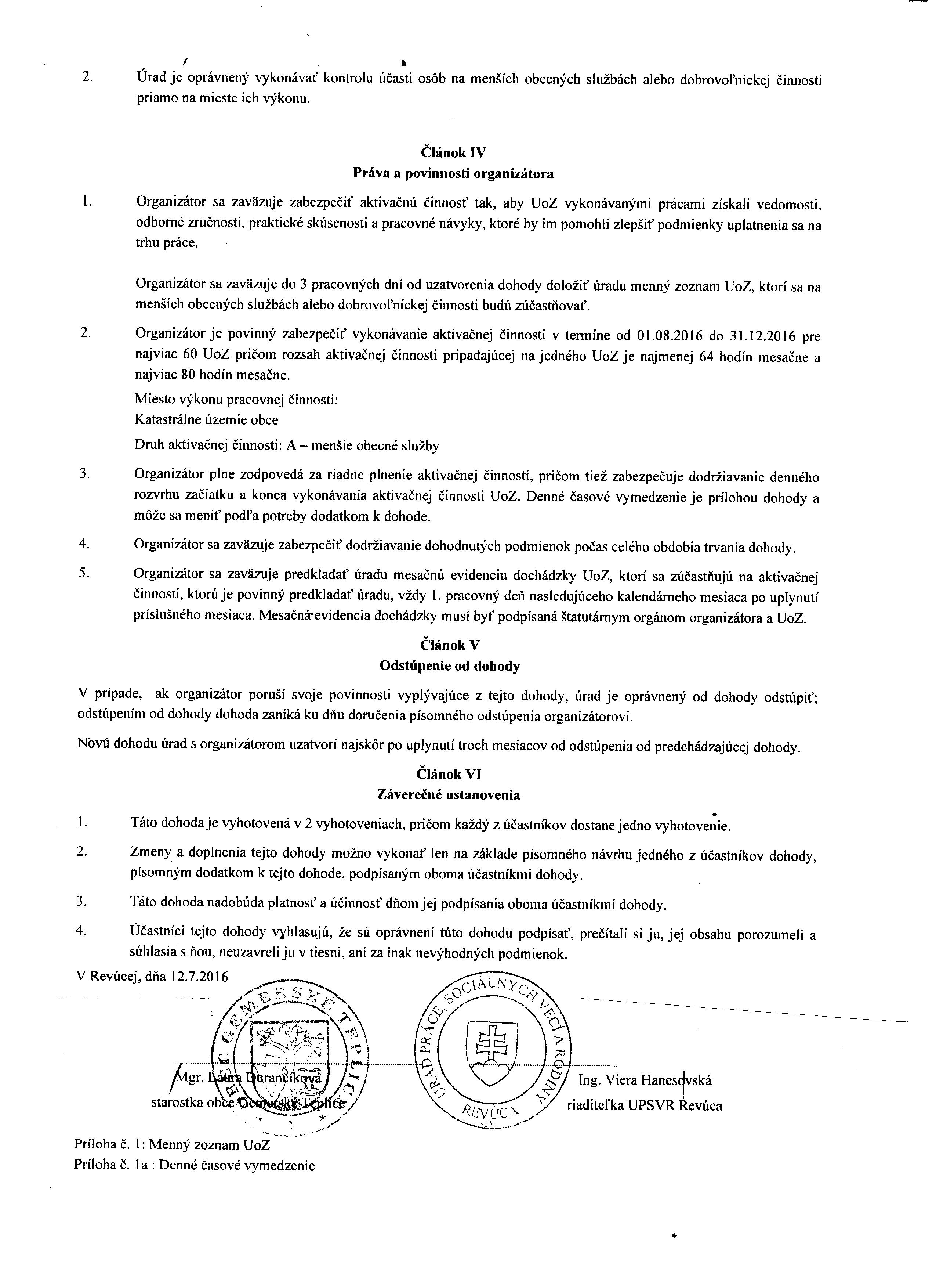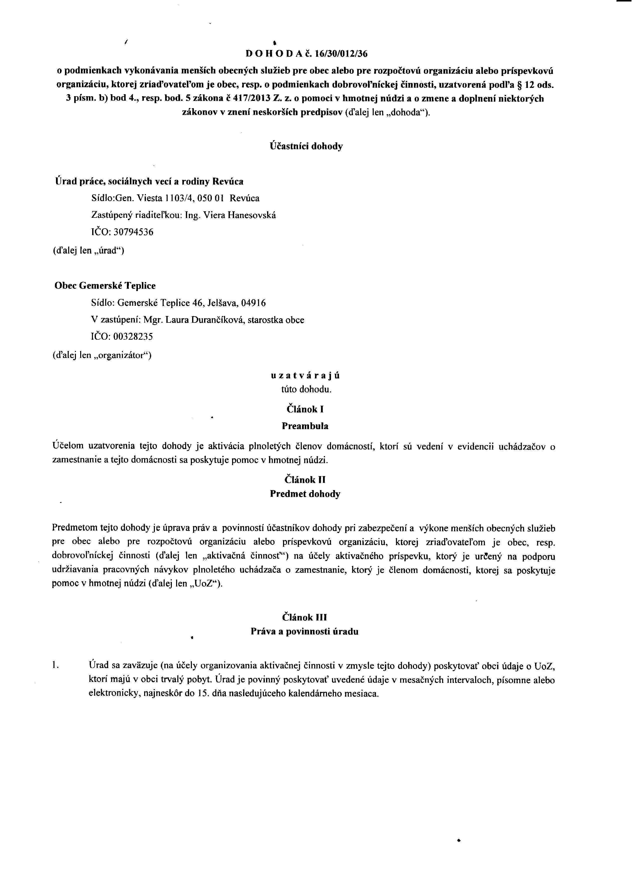 Dohoda č. 16/30/012/36 o podmienkach vykonávania menších obecných služieb pre obec alebo rozpočtovú organizáciu alebo príspevkovú organizáciu, ktorej zria´dovateľom je obec, resp. o podmienkach dobrovoľníckej činnosti, uzatvorená podľa § 12 ods. 3 písm. b) bod 4., resp. bod 5 zákona č 417/2013 Z. z. o pomoci v hmotnej núdzi a o zmene a doplnení niektorých zákonov v znení neskorších predpisov