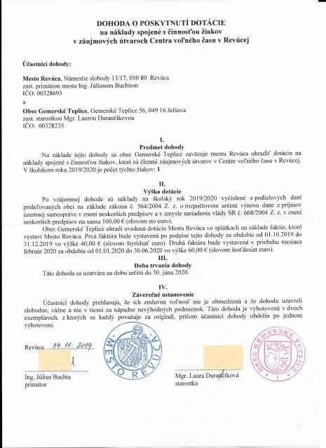 Dohoda o poskytnutí dotácie na náklady spojené s činnosťou žiakov v záujmových útvaroch Centra voľného času v Revúcej Posted on 14. novembra 2019 by gemersketeplice Príloha