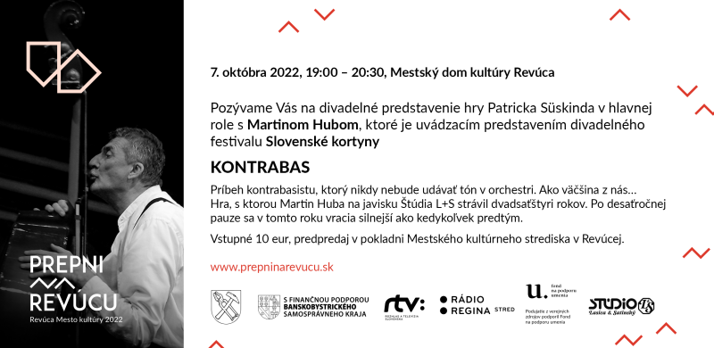 Mesto kultúry Revúca pozýva na mimoriadnu divadelnú udalosť jesene 2022 uvádzame kultovú inscenáciu hry Patricka Süskinda v hlavnej role s Martinom Hubom KONTRABAS 7. októbra 2022, 19:00, Mestský dom kultúry Revúca Posted on 30. septembra 2022 by gemersketeplice