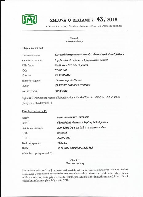 Zmluva o reklame č. 43/2018 Slovenské magnezitové závody, a. s. Jelšava Posted on 6. júla 2018 by gemersketeplice Príloha Príloha