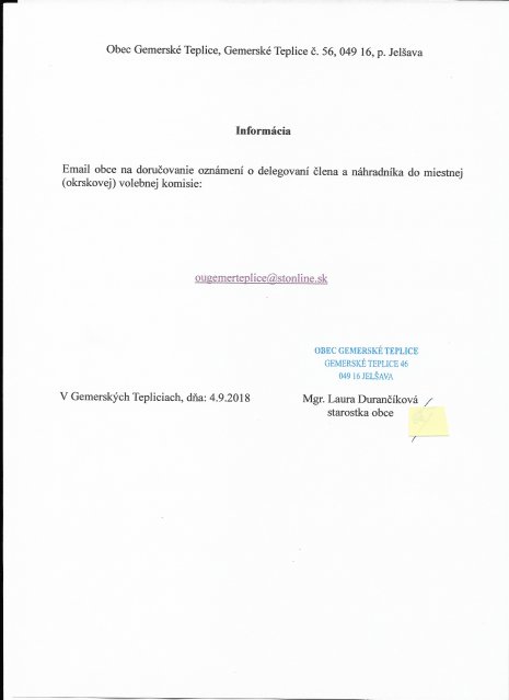 Príloha – informácia o e-mailovej adrese na doručovanie oznámení o delegovaní člena a náhradníka do miestnej(okrskovej) volebnej komisie