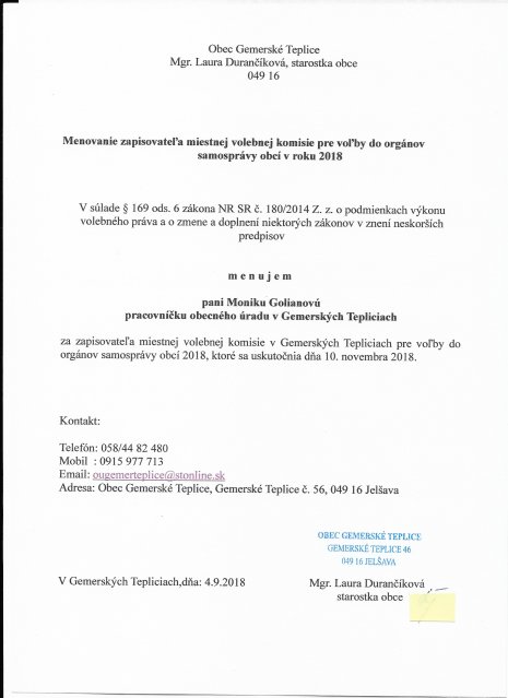 Príloha – oznámenie o počte poslancov a utvorení volebných obvodov v obci Gemerské Teplice