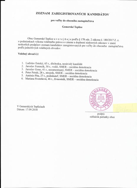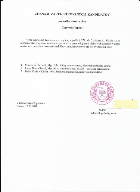 Príloha – zoznam zaregistrovaných kandidátov pre voľby starostu obce Gemerské Teplice