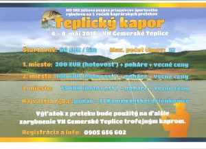Teplický kapor- 1. ročník kaprárskych pretekov 6. – 8. máj 2016 – VN Gemerské Teplice Posted on 22. februára 2016 by gemersketeplice Program:Teplický kapor 2016